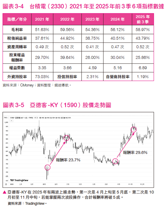 譬如通過所有指標的篩選,最後留下的亞德客-KY(1590),我以「股價律動軌跡法」在2025年操作了2 次(實務操作絕對不是、也不需要三天兩頭就殺進殺出),第一段為4月上旬至5月底,報酬率23.7%;第二段為10月初到11月中旬,報酬率更是達到29.6%,與台積電相比並不遜色。