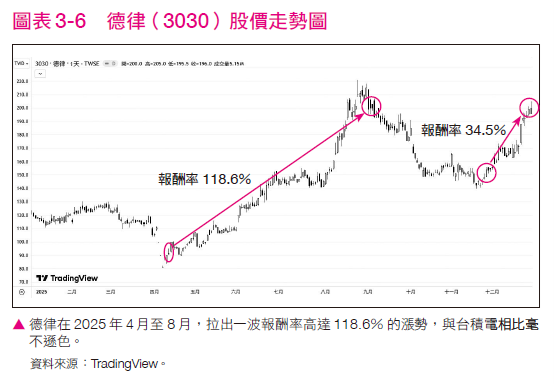 另一檔同樣通過6項指標考驗的德律(3030),我以「股價震盪指標法」,在2025年操作了2次,4月上旬至8月底的第一段報酬率為118.6%;11月底至12月底的第二段報酬率為34.5%,表現更是亮眼。