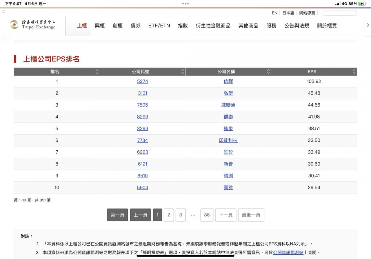 我記得在2000年前後,我們在找一年賺超過一個股本的公司,大概只能找到廿幾家,這次我用EPS排行榜往下搜尋,最後一家賺一個股本的公司是五福旅行社的10.01元。