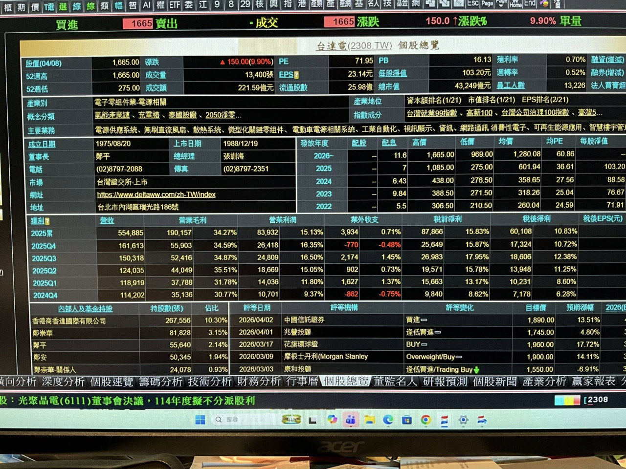但很多人都沒有注意到一直很低調的台達電正在快速崛起。這幾天,台達電股價漲到1705元,市值跑到4.3249兆元,已經穩居台灣第二大巿值企業,而去年這個時候,台達電股價才275元,短短的一年,這個變化不可說不大。
