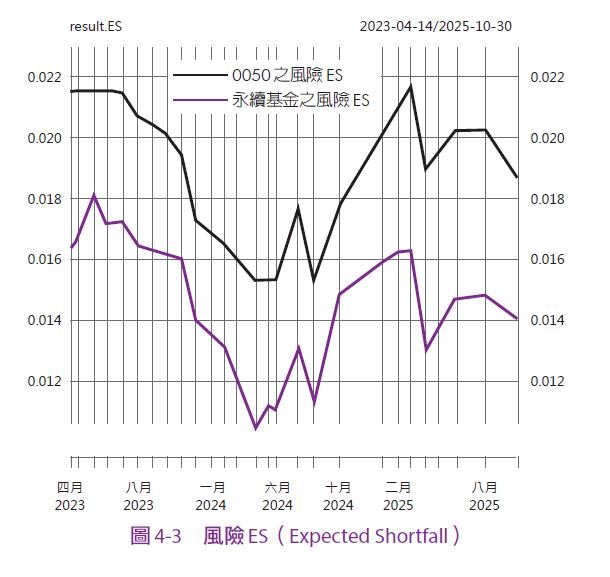 從風險 ES 圖可以看出投資組合的風險值變化,風險值愈低,代表整體部位所承擔的市場風險愈小。圖中顯示,代表清華永續基金的風險值曲線,長期穩定位於 0050 之下,意味永續基金在多數時間承受的市場波動明顯低於大盤。