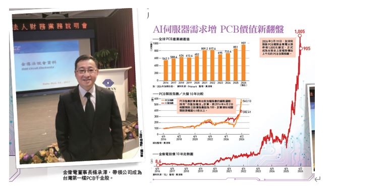 二○二六年三月十九日,台灣資本市場寫下了印刷電路板(PCB)工業史的新頁。這一天盤中,金像電股價衝破千元大關,成為台灣PCB史上第一檔「千金股」。這場平地一聲雷,一舉震碎了長期以來市場對PCB「低毛利、純代工」的刻板標籤,宣告長年苦工的PCB產業,迎來大翻身的時刻。