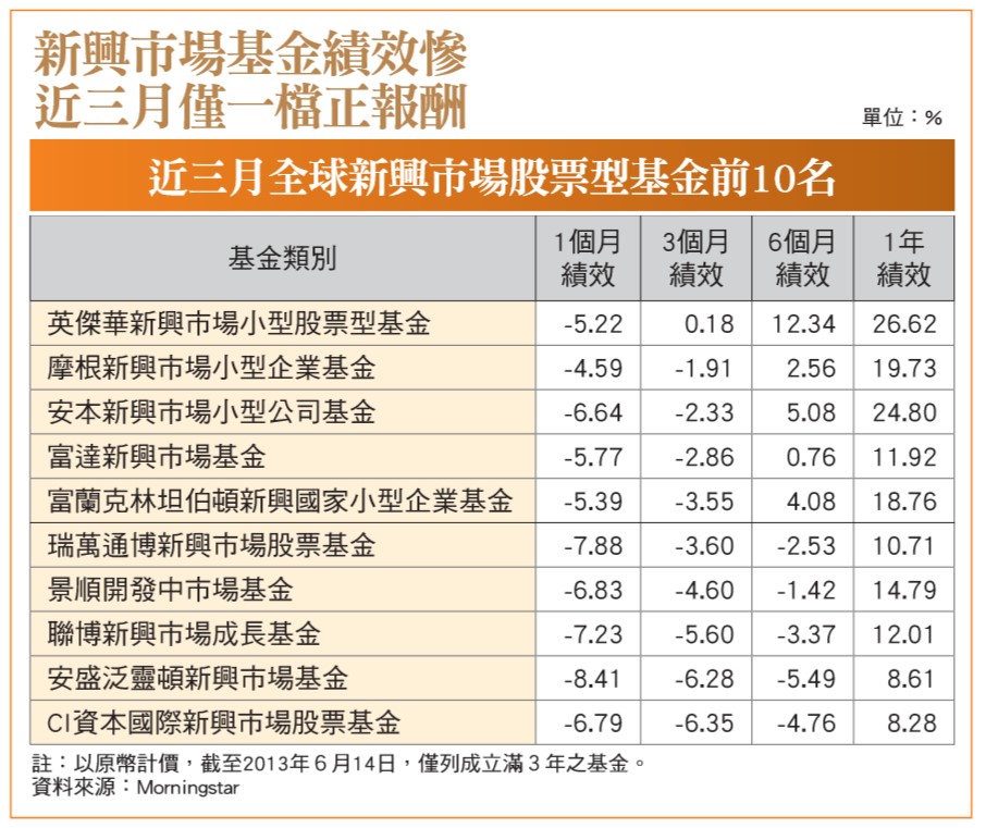資金流動的趨勢也明顯反映在股市上。自五月二十二日至六月十二日,金磚四國中的巴西、俄羅斯股市同步重挫一三%,中國與印度股市則分別有四%及五%跌幅。最讓人意外的是,去年表現極為搶眼、區域內經濟正在高速發展的東協市場,竟也逃不過這一波新興市場大逃殺,據統計,同期間MSCI東協指數(亦稱摩根士丹利資本國際東南亞指數)跌幅達一○%。