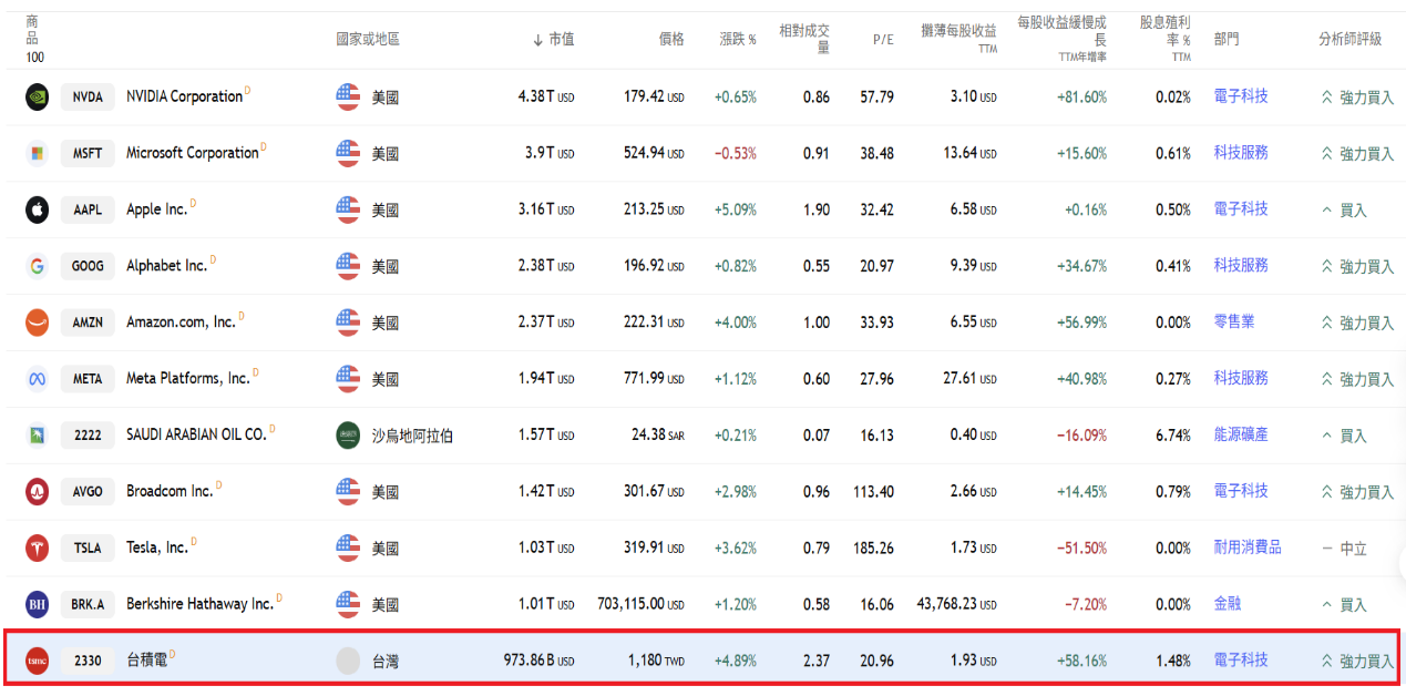 截至2025年8月6日,台積電股票總市值,已躍居全球第11大企業,而前10大企業之中,僅沙烏地阿拉伯國家石油公司(Saudi Arabian Oil Company)為非美國企業,另外9家全部為美國企業,台積電總市值在非美企業的全球排名,僅次於沙烏地阿拉伯國家石油公司,國人習以「護國神山」稱呼台積電,可謂實至名歸,恰如其分。