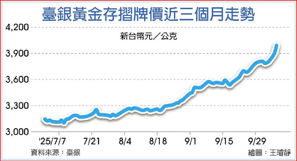 國際金價不斷飆漲,已衝破每盎司4,000美元大關,臺灣銀行黃金存摺牌價8日也來到每公克新台幣3,986元,同步創歷史新高。