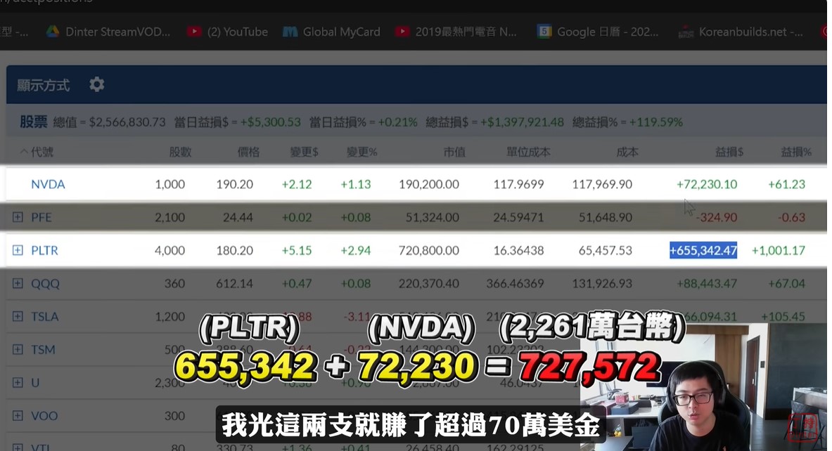 最後丁特總共累積的4000股PLTR,帳上獲利65.5萬美金(約合台幣2047萬),儘管丁特自嘲,PLTR 真正的暴漲是搭上 AI 快車,「運氣成分佔得非常非常重。」