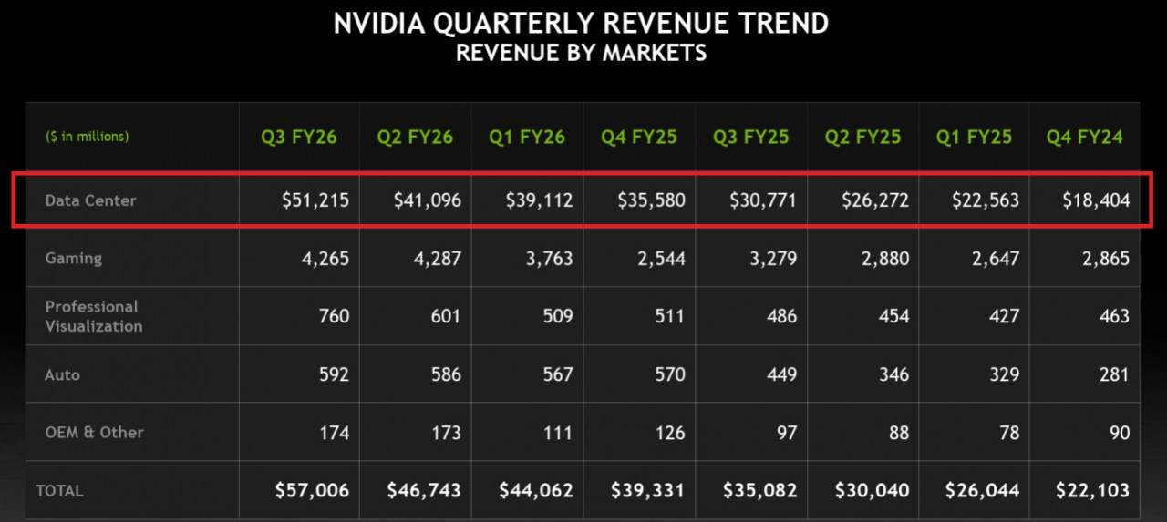 從輝達發表的每季營收趨勢來看,資料中心(data center)依然是主力業務,上季512.15億美元,佔總營收高達89%,且季增25%、年增66%。