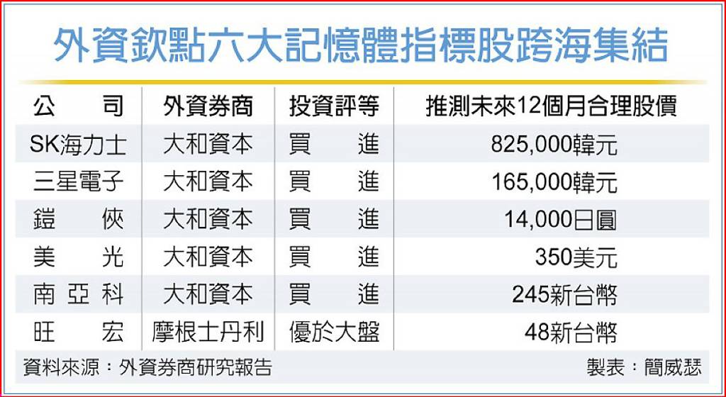 大和資本看好的全球五大記憶體指標股,包括美股的美光,日股的鎧俠,韓股的SK海力士與三星電子,以及台股的南亞科。其中,將南亞科推測合理股價調升至245元。