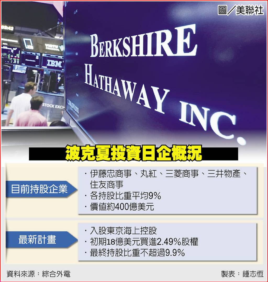 波克夏海瑟威在股神巴菲特退休前,就不斷加碼日本五大商社股票。在其退休後,波克夏仍繼續投資日本企業,其最新計劃以2,874億日圓(逾18億美元,約新台幣576億美元),買進日本產險龍頭東京海上控股(Tokio Marine)持股,為建立策略性合作夥伴關係的一部分;東京海上控股是台灣新安東京海上產險母公司。