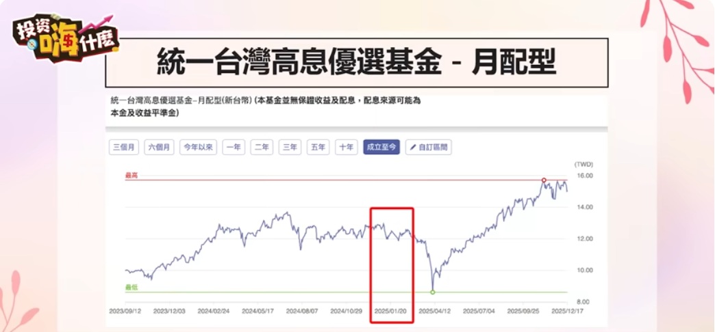 統一台灣高息優選基金分為累積型(不配息)和月配型,雪倫選擇了月配型提供現金流,除了定期定額、低檔扣款外,台股如果當天下跌較多,她也會手動扣款以提高收益機會。