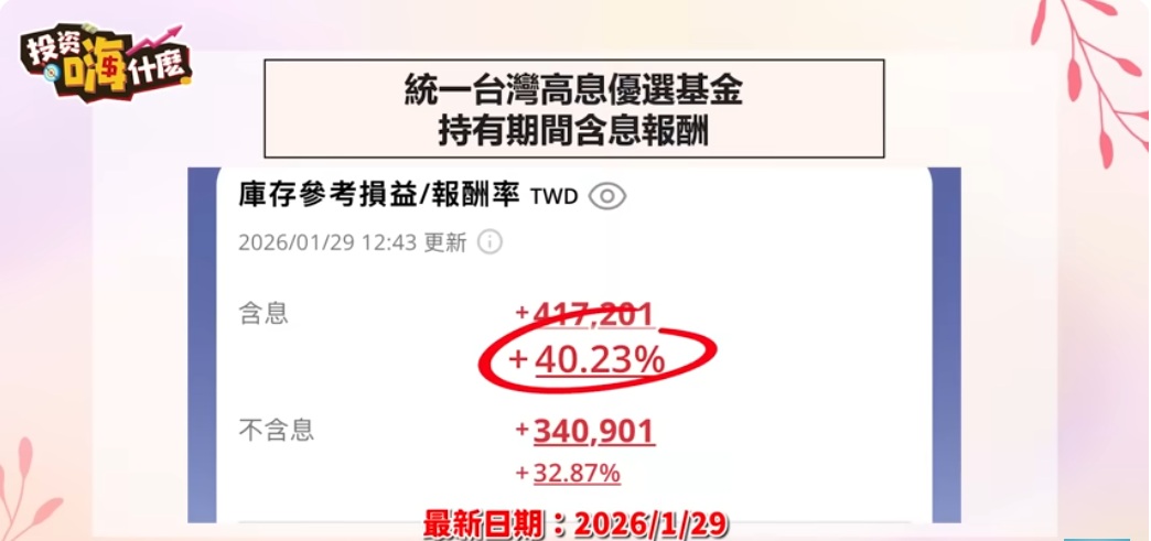 翻開她的報酬率,這檔基金帳上含息報酬已經超過 40%。雖然成立時間不長,但整體淨值走勢穩定向上,除了 2025 年 4、5 月因關稅影響造成市場下跌外,其餘時間表現平穩讓她很滿意。