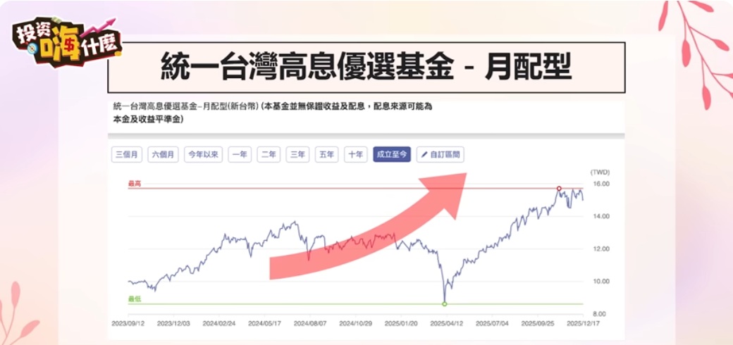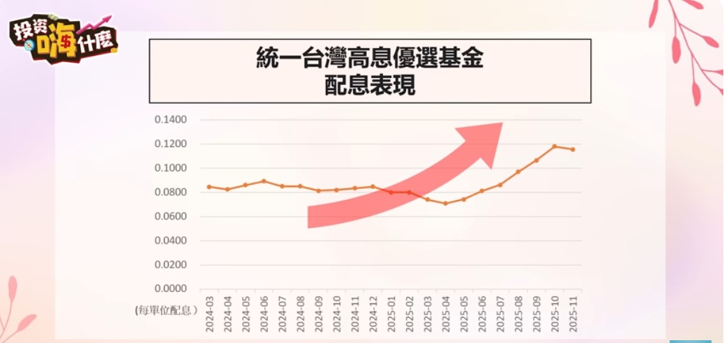 早在 2020 年下半年,財經雪倫就意識到部分高股息 ETF 的配息高於實際收益,長期來看並不健康。在不用花費太多時間在配置與調整,簡單投資的原則下,自組月月配對她來說反而增加負擔。最後她把目光轉向基金市場,把月配高股息的調節出來的資金,一半投入「統一台灣高息優選基金(月配型)」。