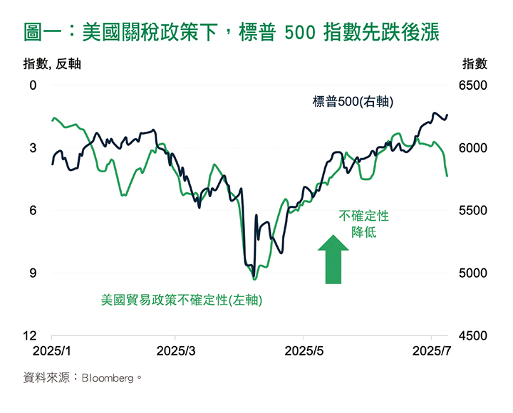 今年的美股大盤走勢與貿易政策的連結相當緊密。川普政府於四月初宣布將大規模課徵關稅時,美股市場一度大跌;同時間,美國貿易不確定性指數攀至高點。爾後,緩課期間美國經濟始終保持穩健,經濟成長率風平浪靜、通膨率未起漣漪,美股不僅回漲,甚至還突破前高(見圖一)。