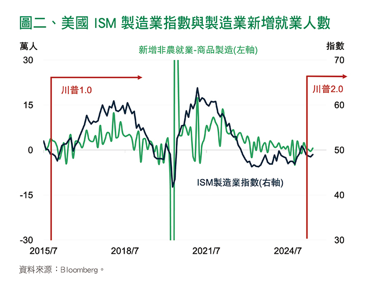 事實上,川普在第一任期時,就已經不斷訴諸製造業回流,當時也一度帶動製造業指數以及提升製造業就業(見圖二)。然而,這樣的趨勢並未維持下去。一方面,新冠疫情帶來的短期衝擊過度巨大,製造業與服務業全面受創;另一方面,接任的拜登總統未能延續川普總統的政策邏輯,因此全球供應鏈的轉移也因此戛然而止。