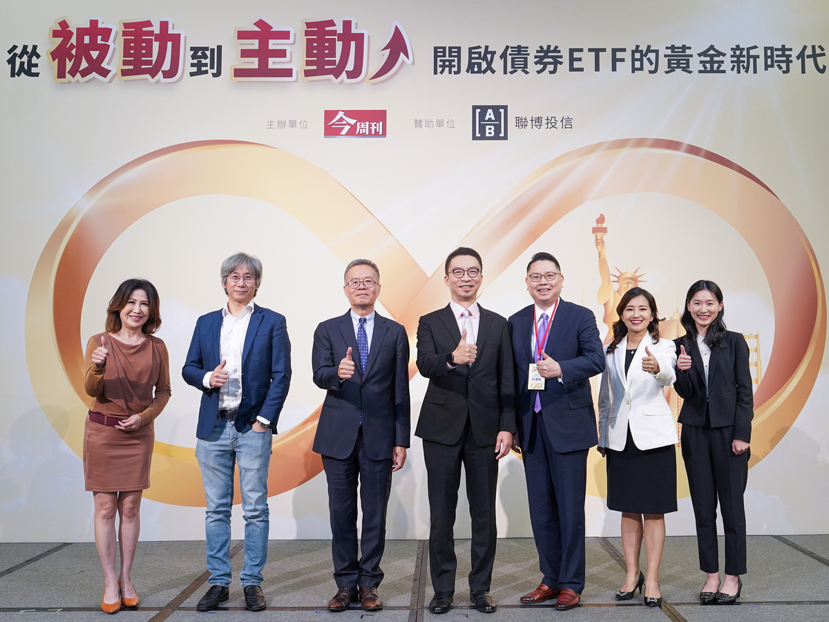 左起資深媒體人陳斐娟、今周刊副社長楊紹華、發行人梁永煌、聯博投信董事長翁振國、凱基證券財富管理處主管阮建銘、聯博投信固定收益資深投資策略師江常維、ETF發展部副總經理鍾郁婕為主動式債券ETF開啟新的序幕。