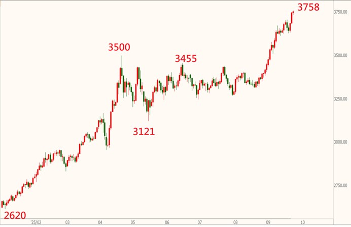 今年一路創高的金價,在9月23日觸及每盎司3758美元,從2024年底大約2620美元起算的話,今年來漲幅已來到43%,即使年底前還有變數,但光目前漲幅也是近40年最強的,在這樣環境下,即使利多環繞還值得搶進嗎?
