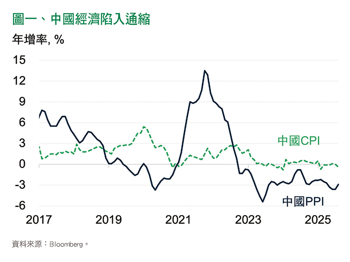 先談經濟。中國經濟真的陷入通縮嗎?答案是肯定的。中國CPI(Consumer Price Index,消費者物價指數)已長期處在〇%附近,PPI(Producer Price Index,生產者物價指數)更在二〇二三年之後就陷入衰退;扣除疫情期間,PPI自二〇一八年開始持續疲軟,是改革開放後的罕見情況(見圖一)。