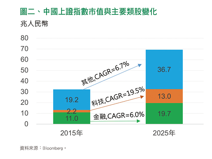 回到股市。既然經濟還未真正回穩,那麼拉動中國股市的因素到底是什麼呢?仔細拆解上證指數,就會發現這十年來主要推動上證指數的類股,早已不是大家理所當然認定的金融股,而是科技股。二〇一五年至今,金融股市值的年化平均成長率為六%,而科技股卻是驚人的十九.五%;目前科技股的總市值為十三兆人民幣已經成為第二大類股,未來幾年將持續挑戰金融股的寶座(見圖二)。
