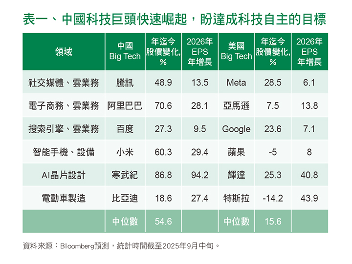 除了寒武紀以外,諸如我們熟悉的騰訊、阿里巴巴、比亞迪、小米等科技巨頭也都在這一波內需升級的政策下受益,對於明年的獲利展望甚至還超過了相對應的美國科技公司,今年以來股價漲幅驚人(見表一)。