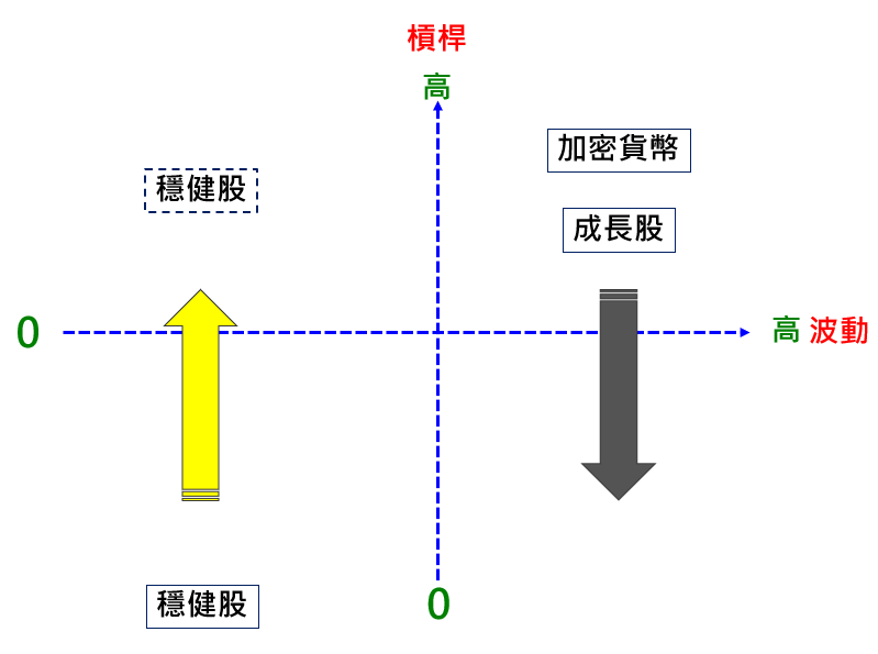 如附圖一,四個象限分別是——高波動高槓桿(右上角)、高波動低槓桿(右下角)、低波動高槓桿(左上角)、低波動低槓桿(左下角)。