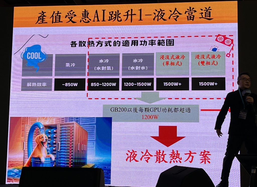 從題材上來看,呂宗耀看好液冷散熱、高階PCB及機構件等概念股。以散熱來說,由於輝達(NVIDIA)的AI伺服器機櫃GB200,每顆GPU的功耗都超過1200瓦,只有散熱效率達到1500瓦的液冷散熱方案可以派上用場。