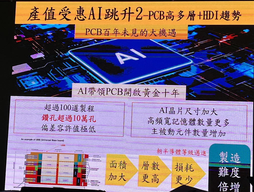 第二是高階PCB,他指出,AI大潮將開啟PCB的黃金十年,因為AI晶片愈做愈大,高頻寬記憶體的數量隨之增加,使得電路板上的主動及被動元件的數量同步大增。