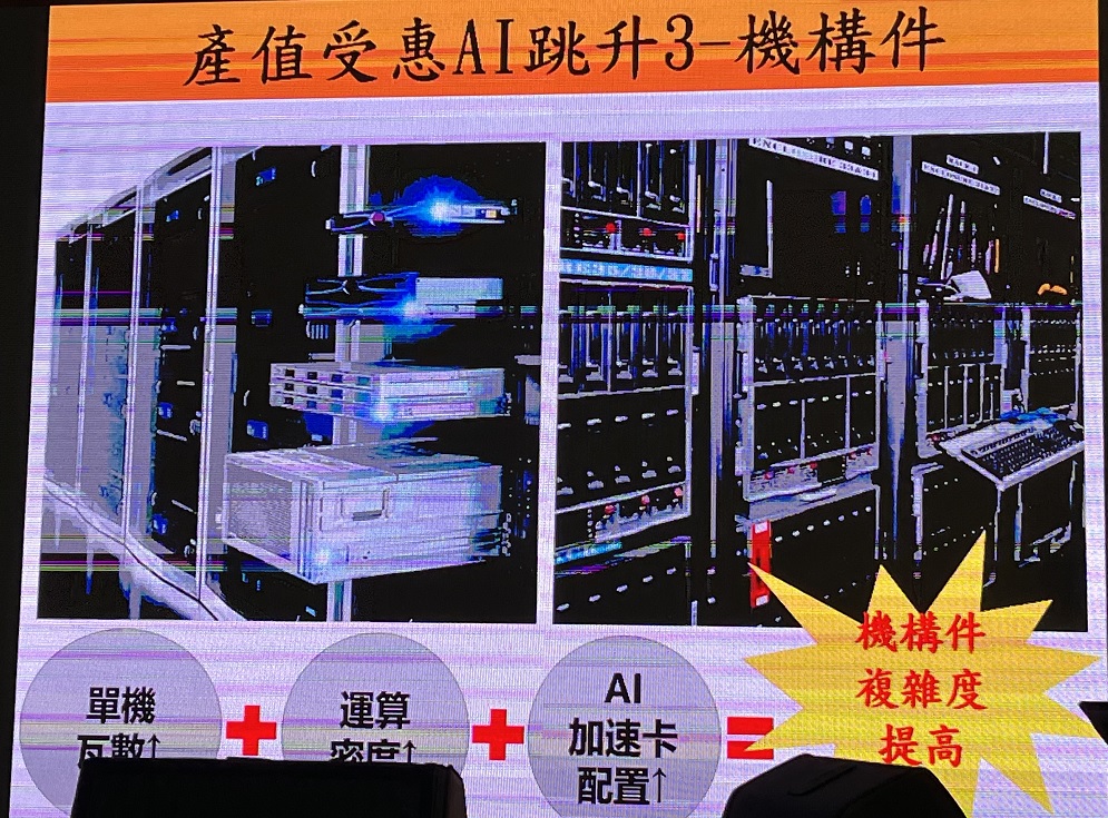 第三是機構件,由於AI伺服器在單機瓦數、運算密度到AI運算晶片的配置數量都同步大增,因此AI伺服器機櫃的複雜度愈來愈高,自然形成供應商的進入障礙。