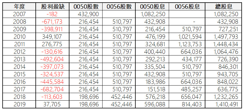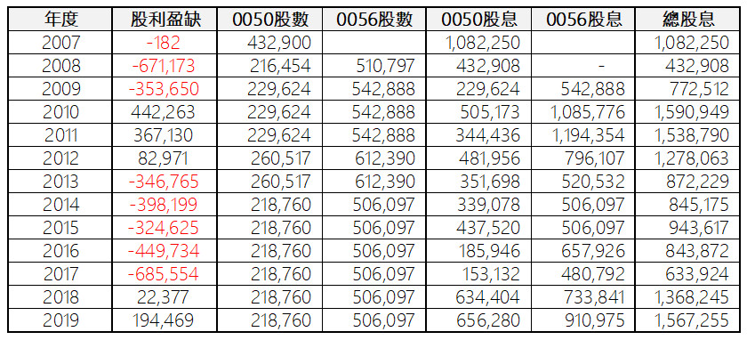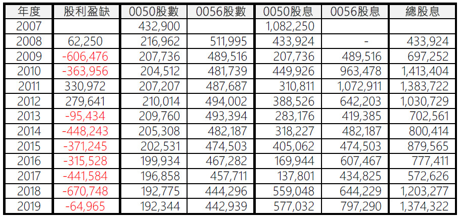 但投資股市不太可能每年都為我們穩定帶來7%的投資報酬率,我用0050與0056的持股來實際模擬計算一下,可以清楚看到,每一年能領的現金股利落差很大,排除2008年的0056不配息,從一年57萬到一年138萬都有,11年的配息紀錄裡,年領股息低於100萬的年度有6次,超過一半。