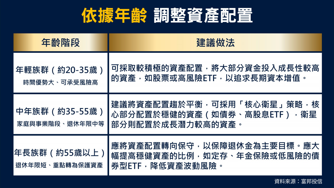 「在川普一句話就能讓市場劇烈震盪的年代,能撐住投資旅程的往往不是速度,而是配置的韌性。」李偉興認為,年輕時可承擔較高波動,隨年齡增長,應逐步提高債券與多重資產比重,尤其9月聯準會啟動預防性降息後,歷史經驗顯示,標普500、那斯達克等指數型ETF在中長期仍具成長潛力,長天期美債與投資等級公司債能發揮一定功能。