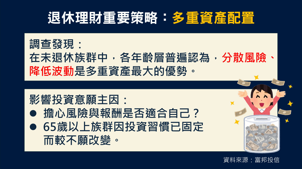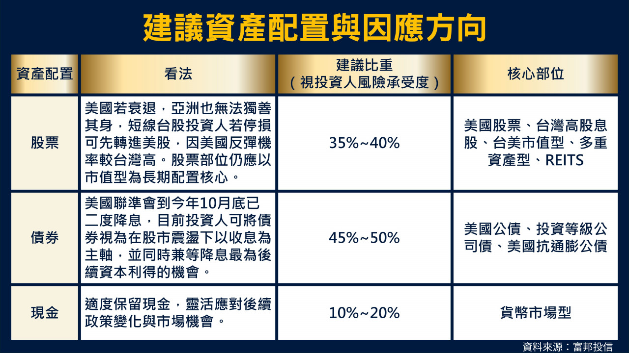 他建議,投資人可回歸基本原則,於股票、債券與現金三大資產間進行配置,並依風險承受度與投資時間調整比例,一般投資人可考慮股票35~45%、債券45~50%、現金10~20%,並隨景氣循環動態修正,或是選擇將多重資產基金納入股票、債券、REITs 等不同資產的全方位布局,有助於分散單一市場波動風險,陪伴投資人較穩定地度過市場震盪期。