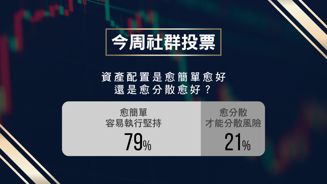 面對高度不確定的環境,本刊社群進行一項投票,有79%投資人認為資產配置應該越簡單越好,才能長期執行,另有21%則認為必須高度分散,才能有效降低風險。富邦投信專家李偉興指出,兩種觀點並不衝突,「好的資產配置是結構清楚、但標的多元。」關鍵在於用容易理解的方式,涵蓋不同風險來源。