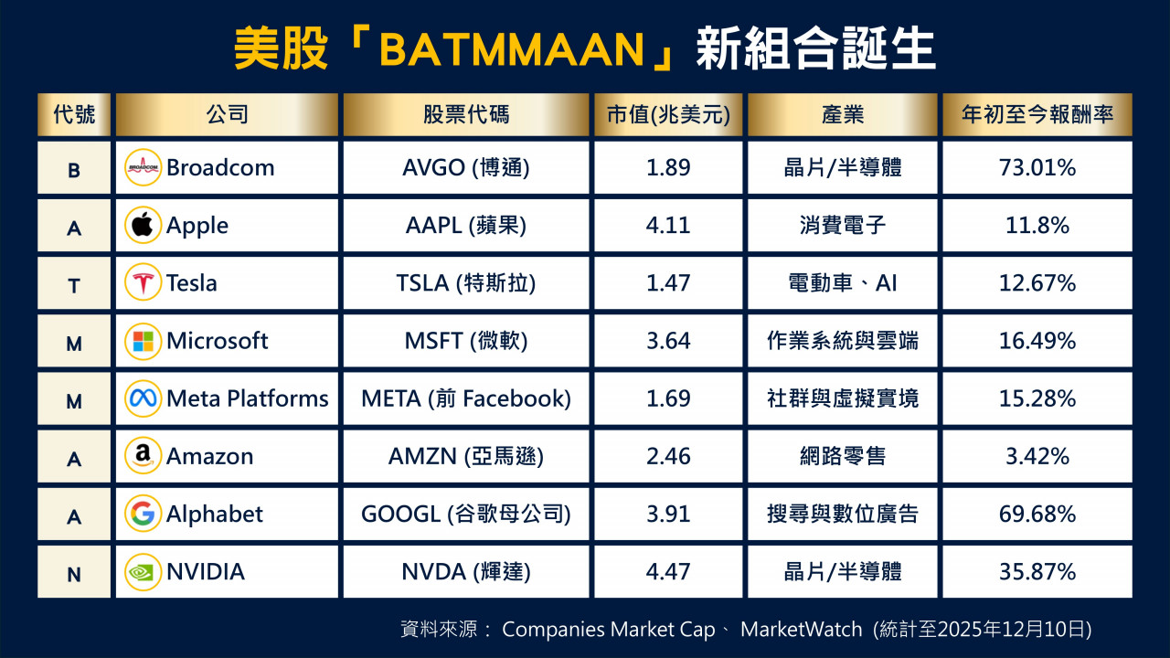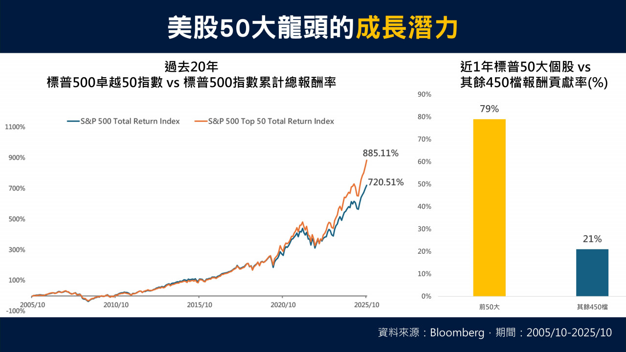 除了傳統七巨頭,隨著博通(Broadcom)市值突破1兆美元,新的強大組合「BATMMAAN」亦隨之誕生。這些企業在獲利能力與現金流上遠優於大盤,是投資人不可忽視的導航指標。此外也要搭配觀察大盤相關性,數據顯示,標普50大企業與大盤相關係數高達97%,但在短中長期報酬率上普遍優於S&P 500,這意味著當美股走升時,指標型龍頭往往漲得更多。