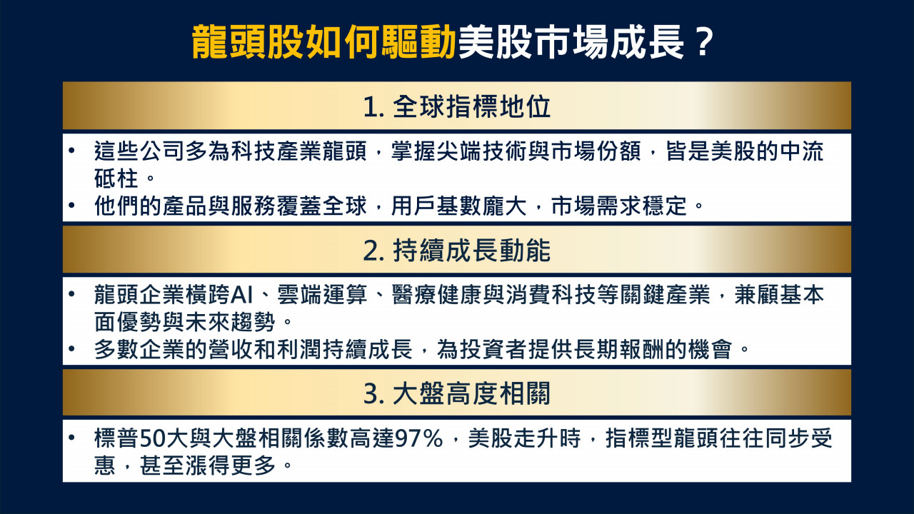 首先是鎖定龍頭企業的成長力,她提到目前S&P 500 指數正由龍頭企業帶動,前10大成分股就佔據總市值將近四成。掌握這些掌握尖端技術、用戶基數龐大且市場需求穩定的全球指標企業,就等於抓住美股成長的主引擎 。