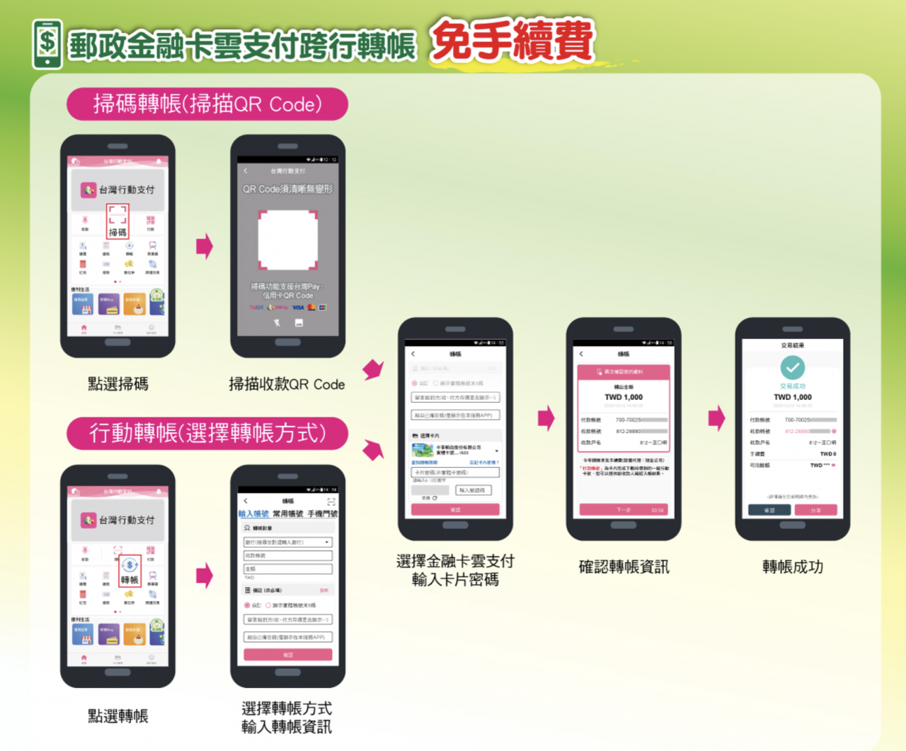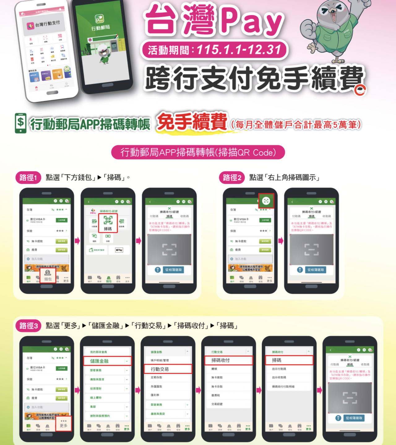 例如,為了鼓勵大家使用數位支付,中華郵政宣布舉辦「台灣Pay跨行支付免手續費」的活動。一直到民國 115 年 12 月 31 日為止,只要使用「行動郵局」App 進行 QR Code 跨行轉帳或是轉帳購物,每個月在 5 萬筆的限額內,通通免手續費;如果是使用「台灣行動支付 App」綁定郵政金融卡雲支付進行轉帳,更是完全沒有筆數限制,直接享有免手續費優惠。