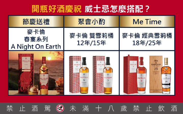 那麼,什麼時候,才適合開一瓶好酒?黃偉綸笑說,「答案其實很生活化。」像是聚會小酌,麥卡倫雙雪莉桶十二年與十五年兼具親和力與層次感,陪伴對話而不搶焦點,自然融入氣氛。在節慶或重要場合,麥卡倫「春宴系列」,常被選為節日送禮,替節慶賦予故事性,讓祝福不流於形式。