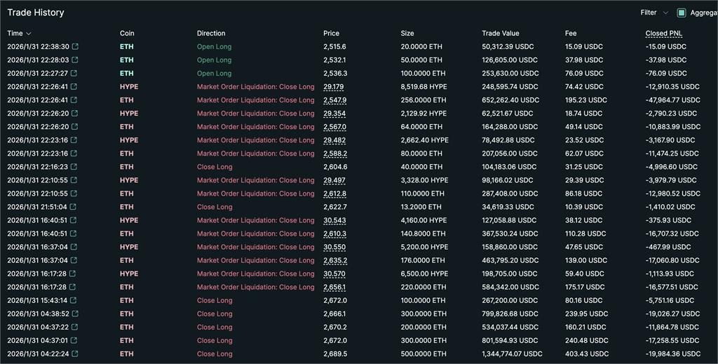 今周刊編按:加密貨幣市場受到宏觀經濟不確定、資金流向變化,以及市場情緒快速反轉等許多因素衝擊下,走勢劇烈震盪。1/31晚間經歷「大屠殺」,比特幣跌破關鍵8萬美元關卡,一度觸及7萬6千美元低點;而以太幣也同步跳水,跌破2500美元關卡。因市場下跌,L.A. Boyz成員「麻吉大哥」黃立成的加密帳戶在短短6小時內已被強制平倉數10次,累計起來已被強制平倉多達241次,帳戶餘額僅剩2萬815美元(約新台幣65萬元)。