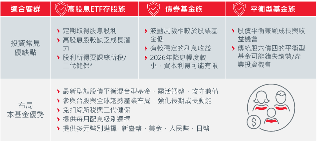 不管你是存債族、高股息存股族或是擔心股市漲多的投資人,透過瀚亞環球增長ETF組合基金(本基金有相當比重投資於非投資等級之高風險債券基金且配息來源可能為本金),不僅能降低單一市場波動,更能透過專業團隊的趨勢判斷,在多空環境中靈活調整布局,真正做到「攻守兼備才心安」的效益。