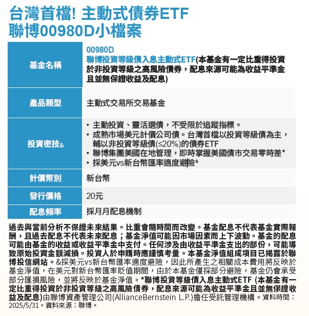 00980D聯博投資等級債入息主動式ETF(本基金有一定比重得投資於非投資等級之高風險債券,配息來源可能為收益平準金且並無保證收益及配息),此檔產品打破被動式債券ETF只能被動追蹤指數的框架,為投資人提供更彈性、貼近市場變化的債券配置新選擇。