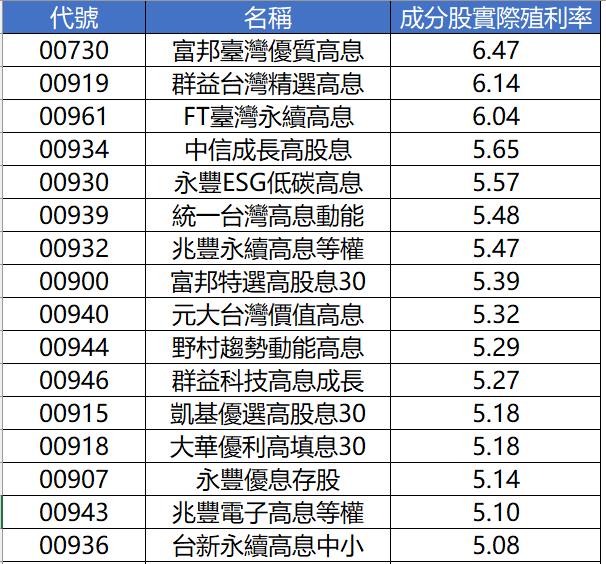 會發現以現有揭露的成分股來計算,選股本身的殖利率表現最高依序為: