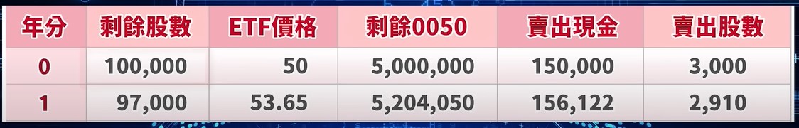 如果你決定每年手動賣出 3%的股票,那麼在第一年,你會賣出約 3張0050,手中的持股會減少到97張。