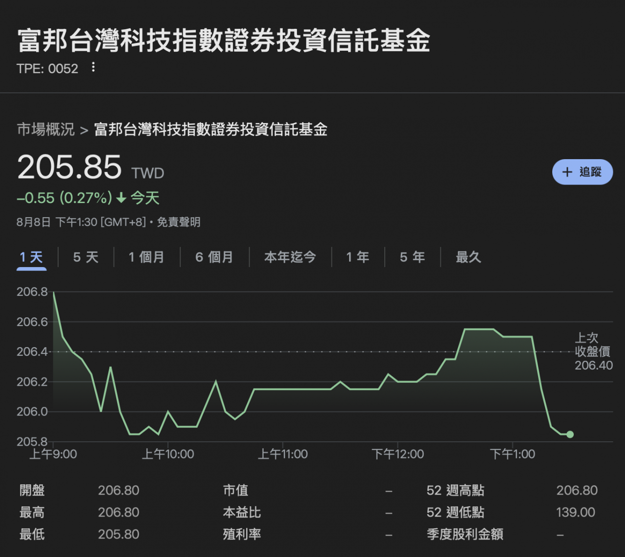 一旦啟動分割計畫,0052預計將會「1拆5」甚至「1拆6」,屆時投資人進場門檻就會大幅降低。若以8月8日收盤價205.85元計算,現行買進1張需投入超過20萬元,分割後一張僅需約4萬元。