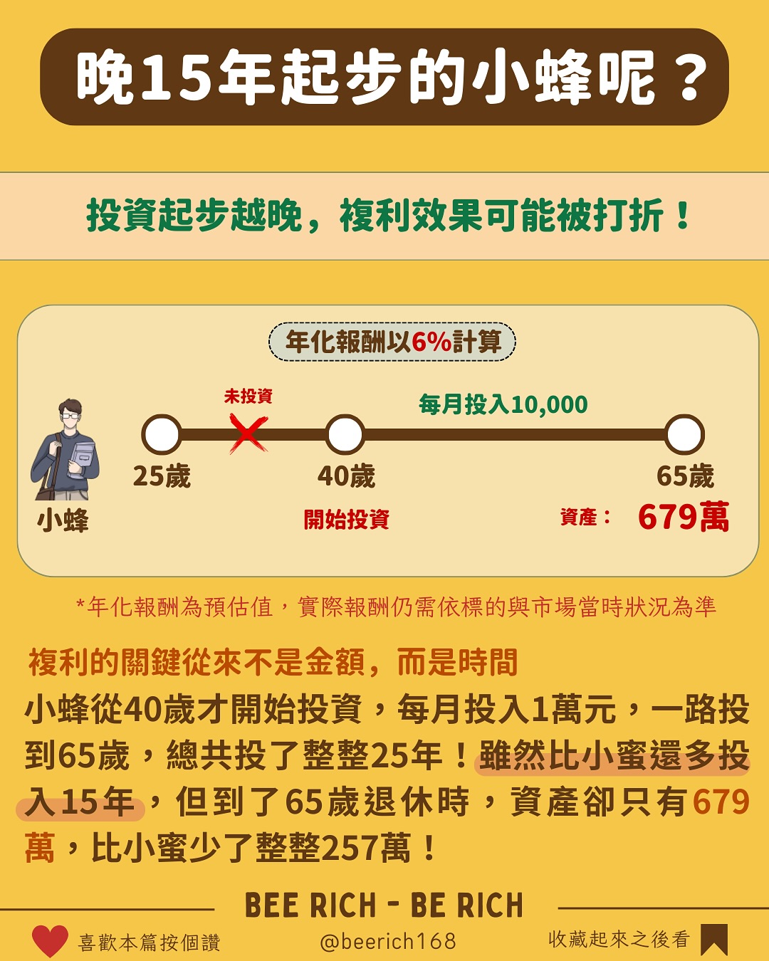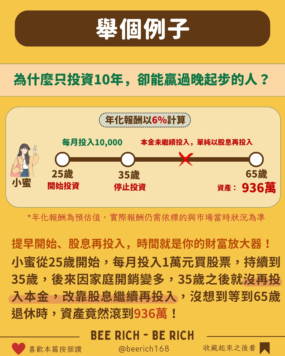 但爹還是要做個風險提醒!投資有賺有賠,文內以年化報酬率6%當示範,不代表每年都真的能穩穩拿得到6%報酬,遇到股災或系統性風險,報酬會波動,也必須評估風險與資產配置,投資就是讓自己用閒錢投入,不影響生活為主唷!