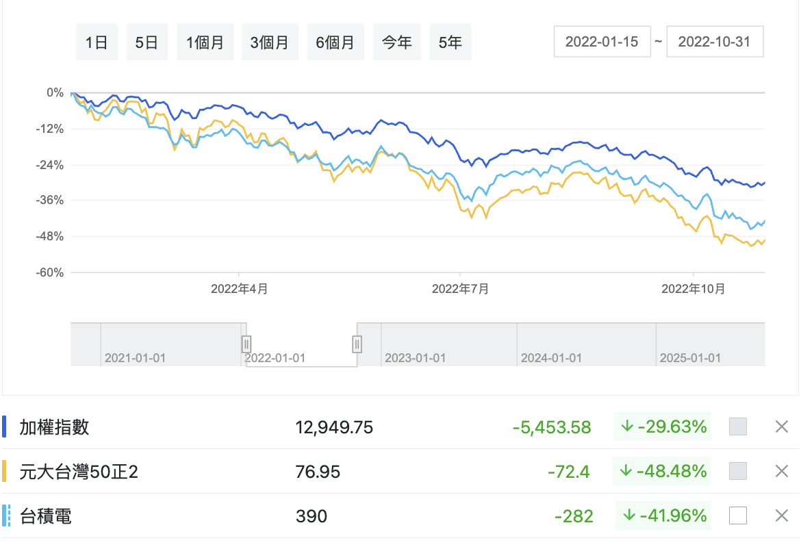 再看 2022 年的空頭比較(2022/1/15~2022/10/31),會發現台積電跌幅接近正二,0050 明顯少一些,畢竟成分股內有電信股跟統一這種相對抗跌的股票。