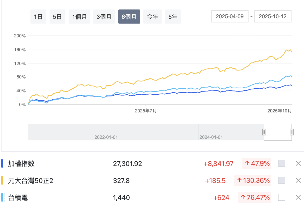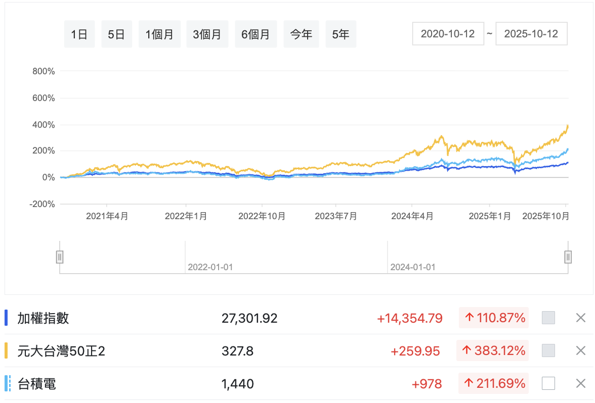 但觀察把時間拉長到近五年(2020/10~2025/10)台積電漲幅是 211%,0050 是110%,台積電比 0050 多一倍,正二的投報率是 383%,0050 跟台積電都狂輸正二。主要是現在台股正在歷史高點導致的。