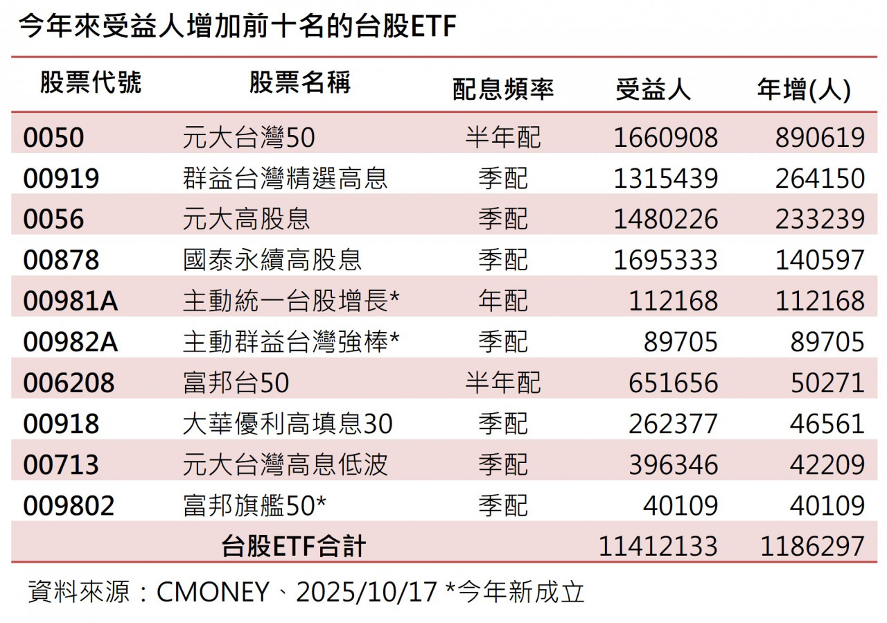 進一步觀察今年來台股ETF受益人單檔表現,增加前10名依序為元大台灣50(0050)、群益台灣精選高息(00919)、元大高股息(0056)、國泰永續高股息(00878)、主動統一台股增長(00981A)、主動群益台灣強棒(00982A)、富邦台50(006208)、大華優利高填息30(00918)、元大台灣高息低波(00713)、富邦旗艦50(009802)。