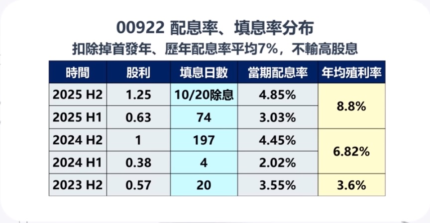 進一步觀察00922過往配息,可以發現每年的第一次總是配較少,第二次則配較多。撇除2023年未滿一年不算,2024年總股利為1.38元,2025年則為1.88元,是逐年成長的喔!上市以來已經配發3.83元總股利。