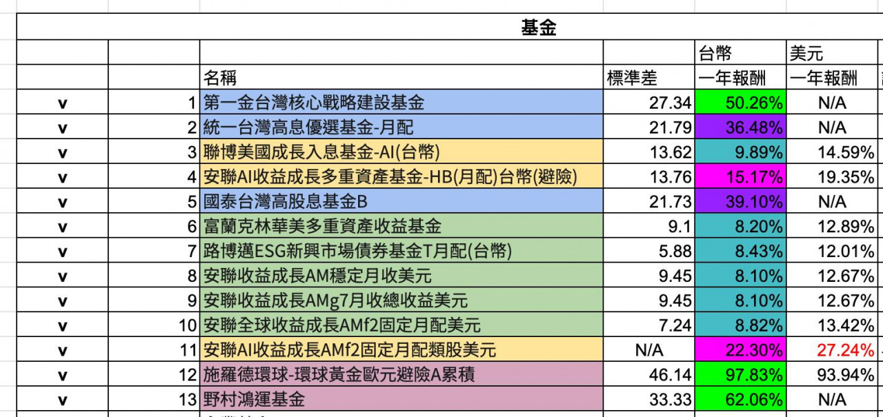 第二步是分類,我有兩個統計表格,一個是風險,用統計標準差去檢視投資的內容,可看出哪一些是高危險的,哪一些是較穩定的。