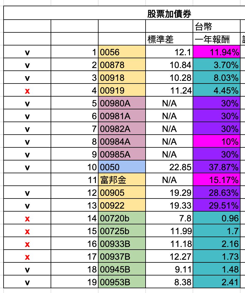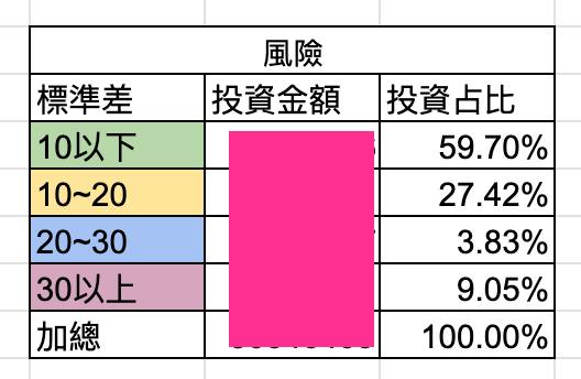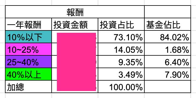 另一個表格是統計各類報酬佔比的,報酬當然越高越好,但要注意比例控制,通常高報酬跌幅也越深,我會找一些報酬率在10~25以上,而標準差也能在10~20間,當作未來的核心之一,當然,標準差10以下的也是,但比例就看各自需求了!
