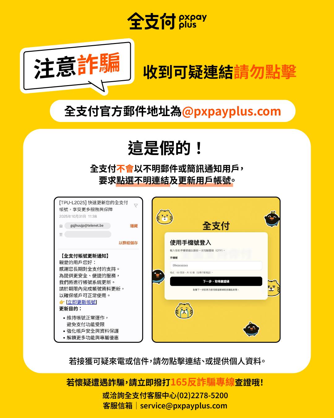 - 收到不明信件請確認官方郵件地址為@pxpayplus.com;全支付不會以不明郵件或簡訊通知,或要求您點選不明連結。