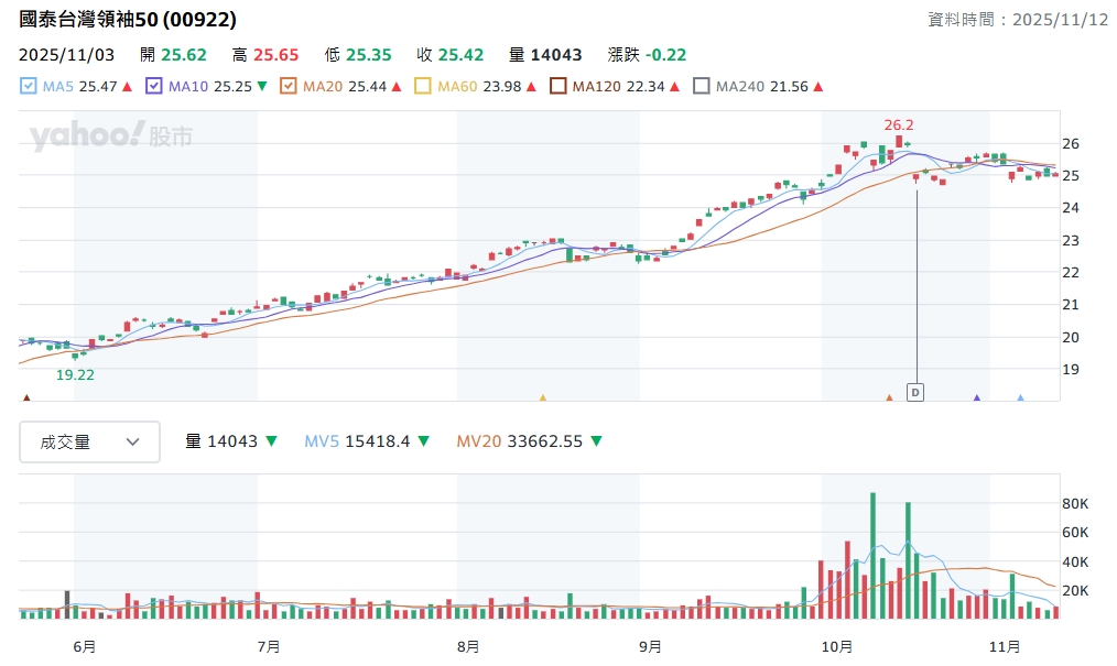 不少人覺得鴻海股價太高,想要上車但又買不起,市值型ETF 00922的第2大持股就是鴻海,比重高達6.07%,隨著鴻海股價飛奔向上,00922也跟著飆漲。不過00922 (11/14)股價隨著大盤走低,終場下跌0.47元,以24.51元作收。而最新配息1.25元已於11/13進帳,達人表示可以考慮再投入滾大本金。
